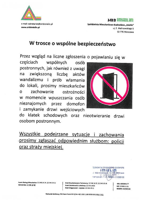 Przez wzgląd na liczne zgłoszenia o pojawianiu się w częściach wspólnych osób postronnych, jak również z uwagi na zwiększoną liczbę aktów wandalizmu i prób włamania do lokali, prosimy mieszkańców o zachowanie ostrożności w momencie wpuszczania osób nieznajomych przez domofon i zamykanie drzwi wejściowych do klatek schodowych oraz nieotwieranie drzwi osobom postronnym.