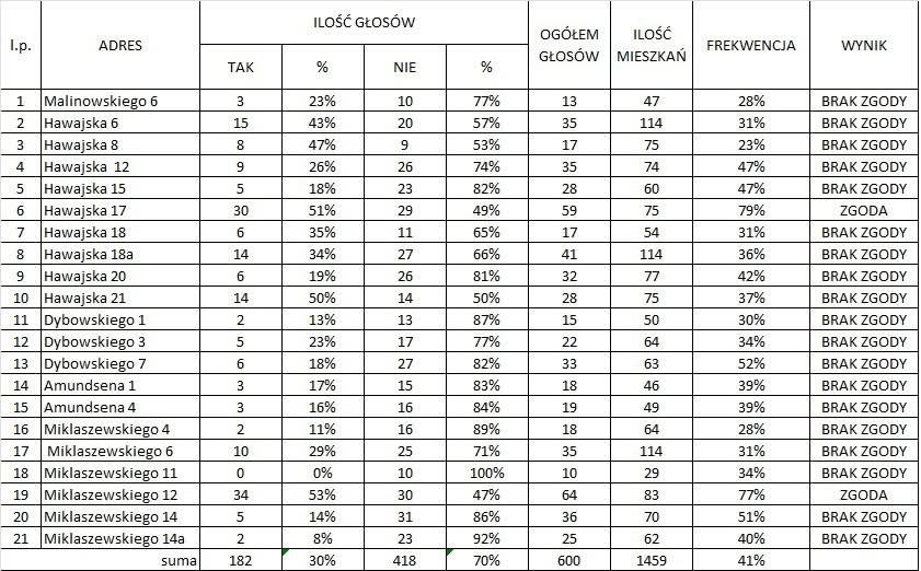 Po podliczeniu wszystkich oddanych głosów okazało się, że w ankiecie wzięło udział 600 osób co stanowi 41% uprawnionych do głosowania. To jest bardzo, bardzo dobry wynik. 182 osoby wyraziły zgodę na najem dachu pod instalację telekomunikacyjną (30% wszystkich oddanych głosów), 418 osób było przeciw (70%). Szczegóły w załączonej tabeli.