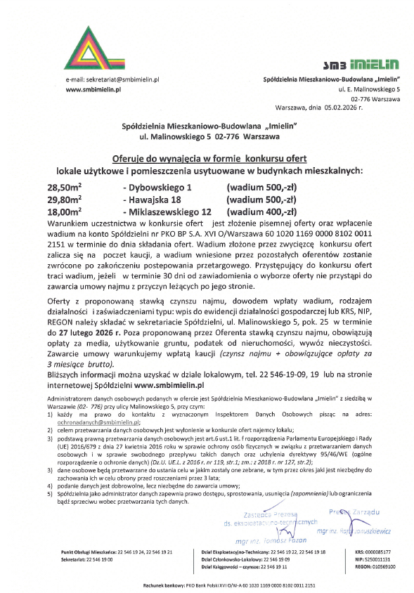Konkurs ofert na lokale użytkowe i pomieszczenia usytuowane w budynkach mieszkalnych Dybowskiego 1 28,50m2 Hawajska 18 29,80m2 Miklaszewskiego 12 18,00m2