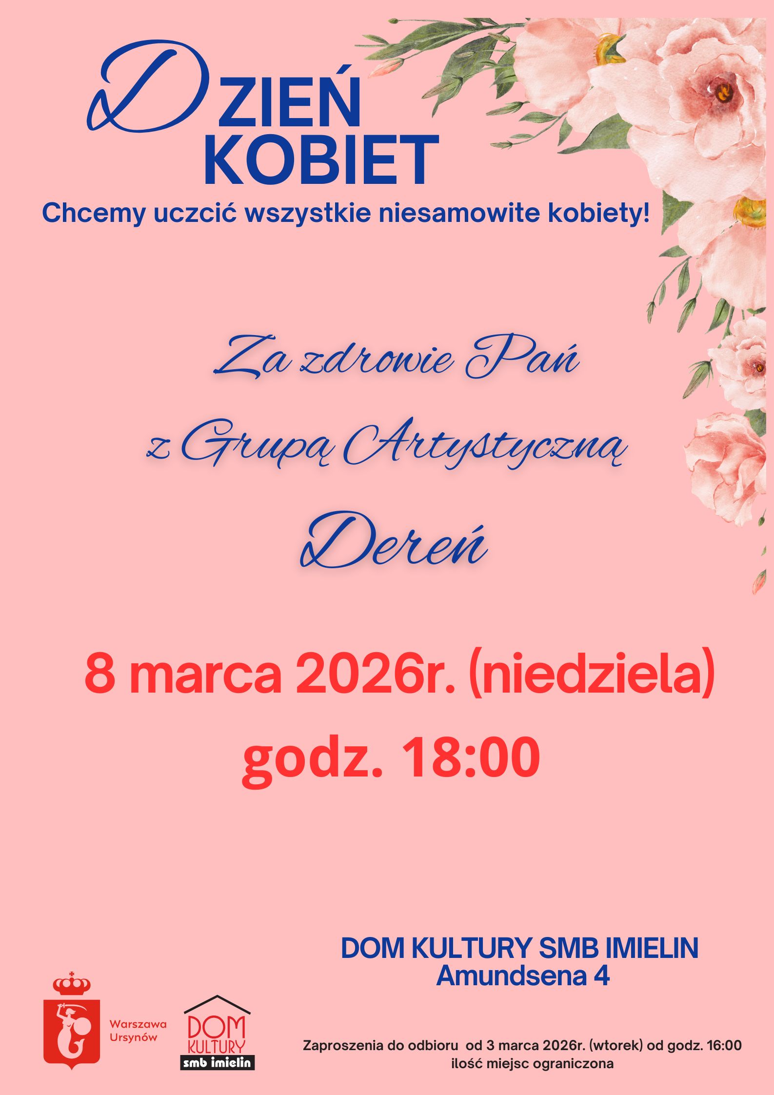 Koncertu Grupy Artystycznej Dereń z okazji Dnia Kobiet Kiedy: 8 marca 2026 r. (niedziela) Godzina: 18:00 Gdzie: DK SMB "Imielin" przy ul. Amundsena 4