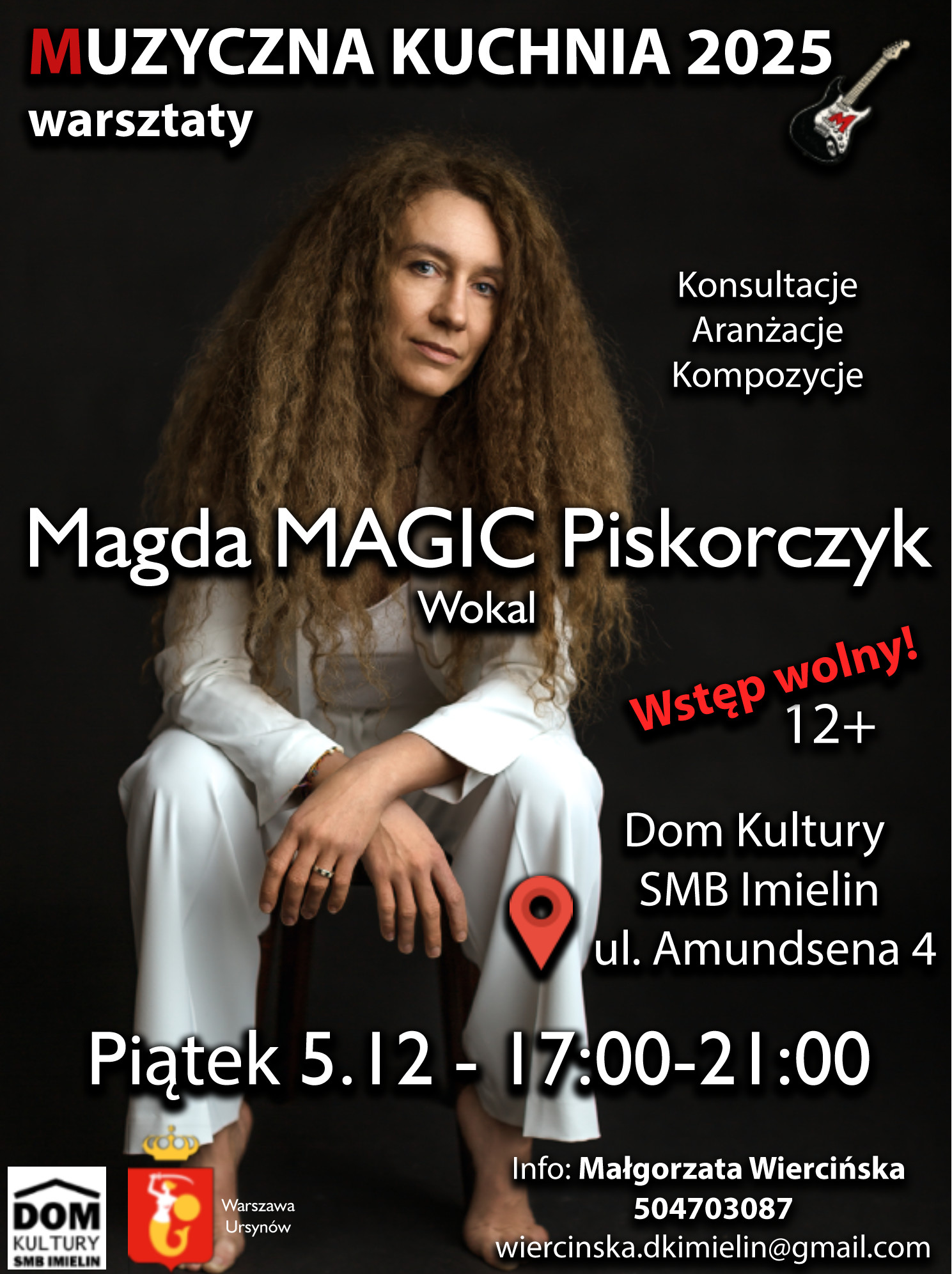 MUZYCZNA KUCHNIA 2025 - Magda MAGIC Piskorczyk warsztaty Kiedy: 05.12. 2025 r. (piątek) Godzina: 17:00-21:00 Gdzie: DK SMB Imielin ul. Amundsena 4 *Wstęp wolny 12+