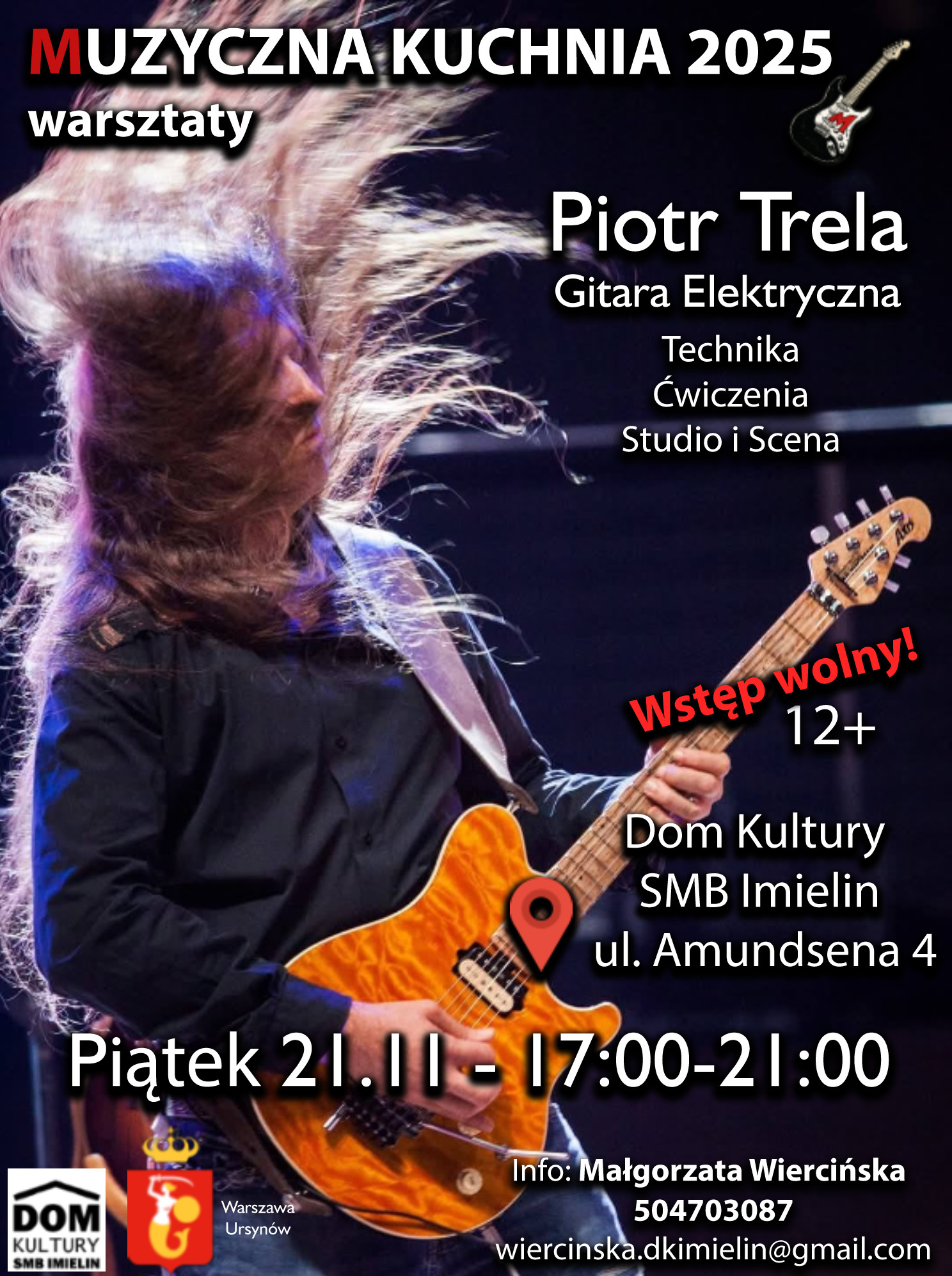 Muzyczna kuchnia 2025 Warszawa, 17.11.2025 r. Wystąpi Piotr Trela Kiedy: 21.11 (piątek) Godzina: 17:00-21:00 Gdzie: DK SMB IMIELIN ul. Amundsena 4 Wstęp wolny! 12+