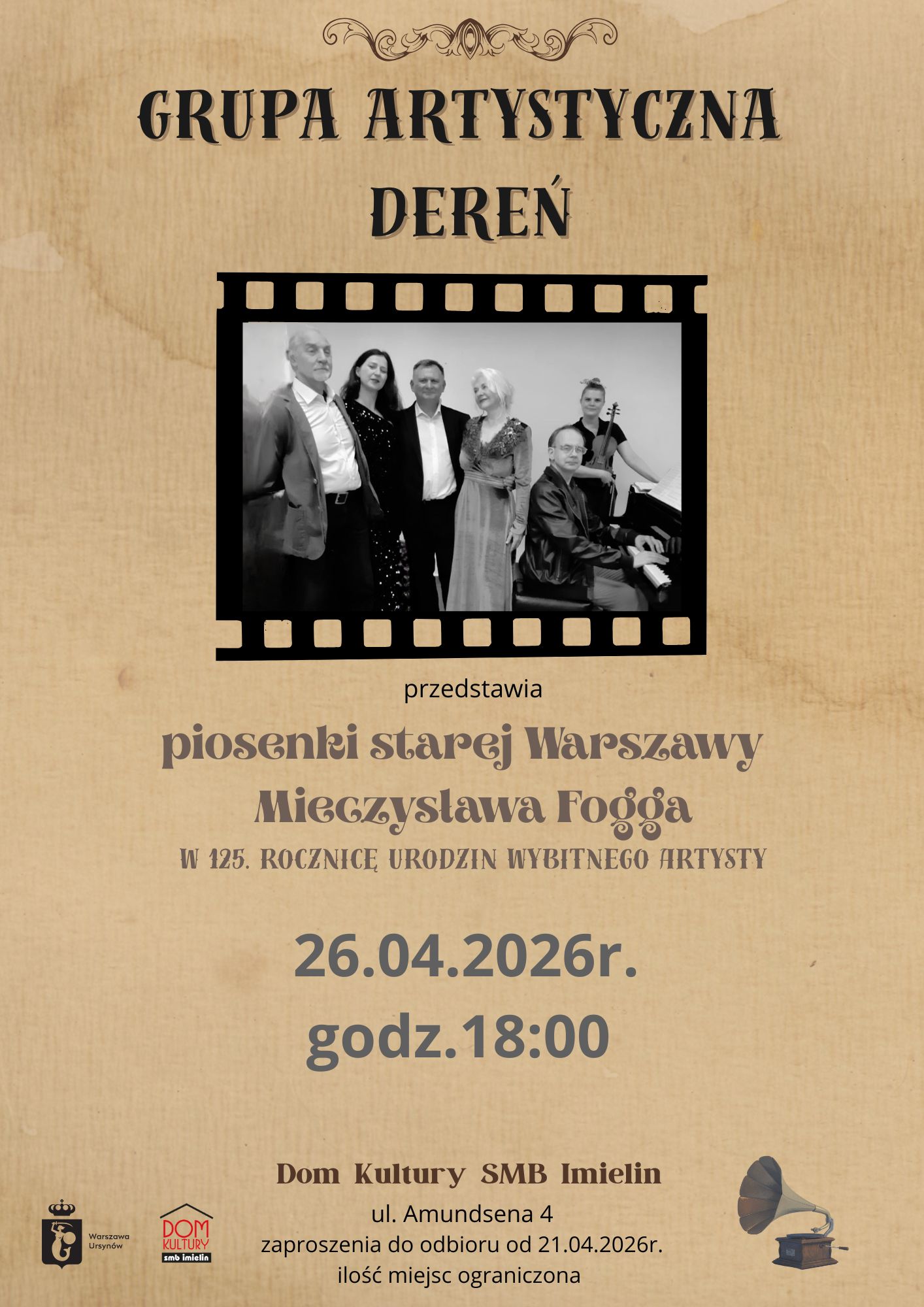 Warszawa, 17.04.2026 r. Występ Grupy Artystycznej DEREŃ - piosenki starej Warszawy Mieczysława Fogga Kiedy: 26 kwietnia br. (niedziela) Godzina: 18:00 Adres: Dom Kultury SMB "Imielin" przy ul. Amundsena 4